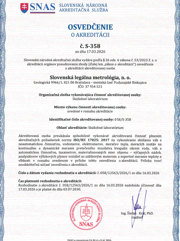 Spôsobilosť laboratórií SLM vykonávať skúšanie meradiel nestranne a dôveryhodne je od roku 2008 kontinuálne deklarovaná akreditáciou SNAS (ISO/IEC 17025). Platné osvedčenie o akreditácii S-358 je dostupné tu.