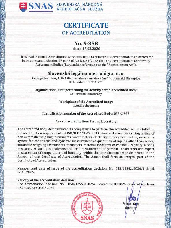 The competence of SLM laboratories to perform testing of measuring instruments impartially and reliably has been continuously declared since 2008 by SNAS accreditation (ISO/IEC 17025). The valid accreditation certificate S-358 is available here.