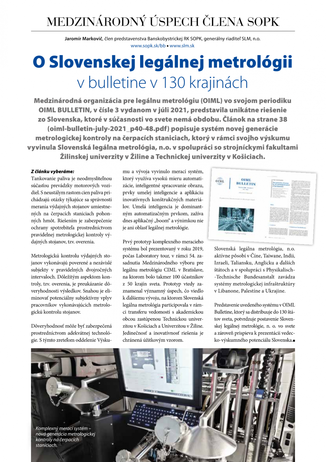 V čísle 10/2021 mesačníku Slovenskej obchodnej a priemyselnej komory (SOPK) OBCHOD PRIEMYSEL HOSPODÁRSTVO bol uverejnený článok o medzinárodnom úspechu člena SOPK Slovenskej legálnej metrológii, n. o., a to o uverejnení článku v OIML BULLETIN (číslo 3 vydanom v júli 2021) popisujúcim systém novej generácie metrologickej kontroly na čerpacích staniciach, ktorý v rámci svojho výskumu vyvinula Slovenská legálna metrológia, n.o. v spolupráci so strojníckymi fakultami Žilinskej univerzity v Žiline a Technickej univerzity v Košiciach. Toto unikátnom riešenie zo Slovenska v súčasnosti nemá vo svete obdobu.