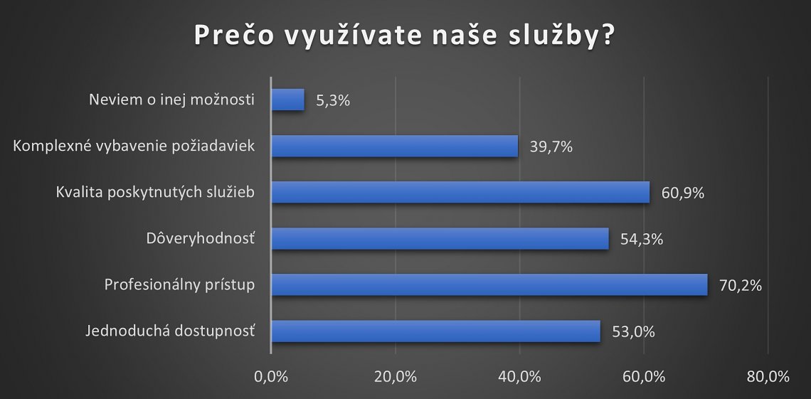 Na základe výsledkov prieskumu môžeme konštatovať vysokú mieru zákazníckej spokojnosti s našimi službami. Až 97,4 % zákazníkov, ktorí sa zapojili do prieskumu vyjadrilo spokojnosť na škále „veľmi spokojný/á“ a „skôr spokojný/á“. Ako dôvody využívania našich služieb zákazníci uviedli predovšetkým profesionálny prístup a kvalitu poskytnutých služieb. Viac než polovica opýtaných zákazníkov taktiež vyzdvihla dôveryhodnosť a jednoduchú dostupnosť našich služieb.