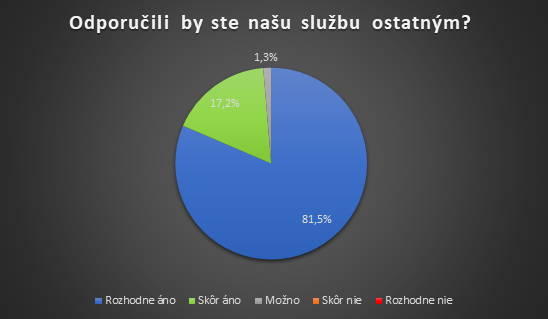 Výsledky poukazujú na to, že až 98,7 % zákazníkov, ktorí sa zapojili do prieskumu by nás „rozhodne áno“ alebo „skôr áno“ odporučilo ostatným ľuďom.